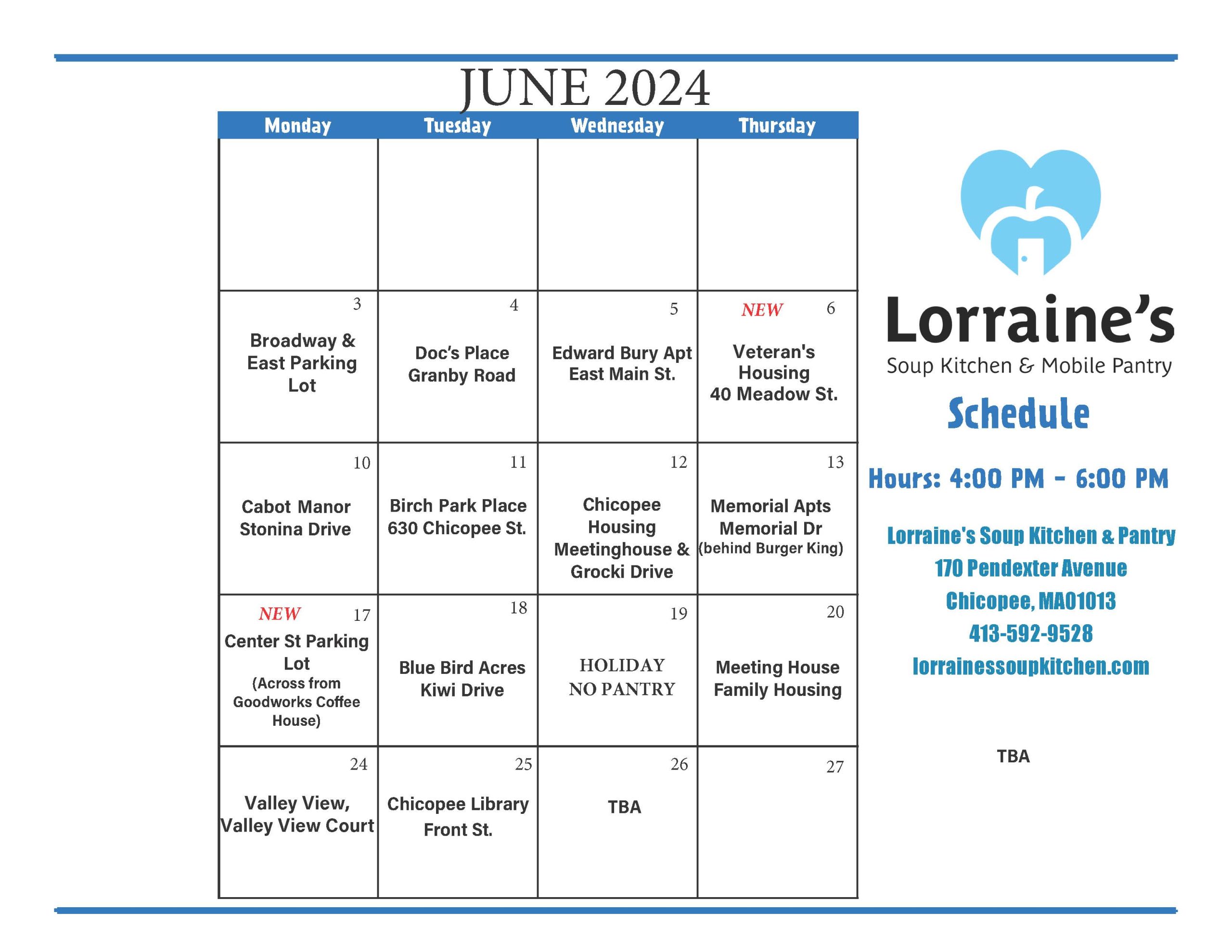 Lorraine's Soup Kitchen 170 Pendexter Ave, Chicopee, MAPlease be advised Lorraine's Soup Kitchen and Pantry will be [...]